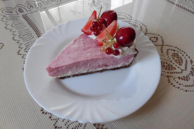 Zvlášť ušleháme šlehačku, přišleháme tvaroh, cukr, šťávu z limetky nebo citrónu. Přidáme rozpuštěnou vlažnou želatinu a rozmixované jahody. Promícháme a nalijeme do sušenkové skořepiny. Urovnáme povrch a dáme ztuhnout do ledničky alespoň na 4 hodiny.