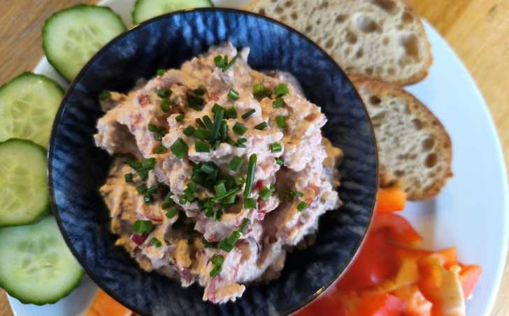 Uherský salám umeleme nebo rozmixujeme najemno ve food procesoru. Papriku a cibuli nakrájíme na malé kostičky.