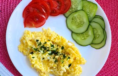 Když žampiony povolí, tak je vařečkou hezky rozptrostřu na pánvi, ztlumím plamen na minimum a přiliju rozšlehaná vajíčka. Počkám až se spodek omelety trochu zatáhne a navrch hezky naskládám rajčata, špenát a slaninu. Osolím, opepřím a pánev přikryju pokličkou. Až se vajíčka zatáhnou i napovrchu, mám hotovo.