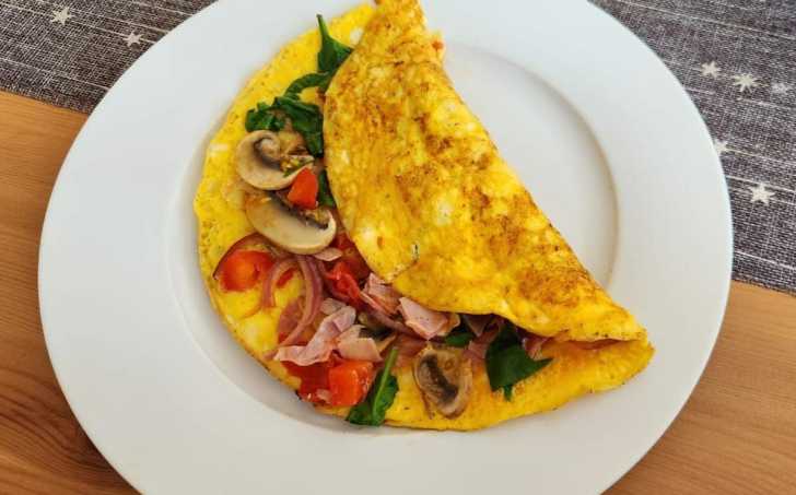 Poté dáme stranou na talířek a na pánev dáme rozkvedlaná vajíčka. Počkáme až trochu zespoda zatuhnou a poté na ometu rozprostřeme uvařenou zeleninu, přidáme nakrájenou šunku a špenát. Přiklopíme pokličkou a vaříme dokud nejsou vejce hotová a špenát neovadne.