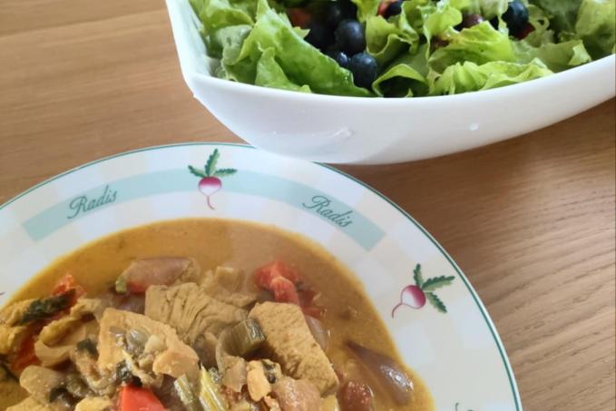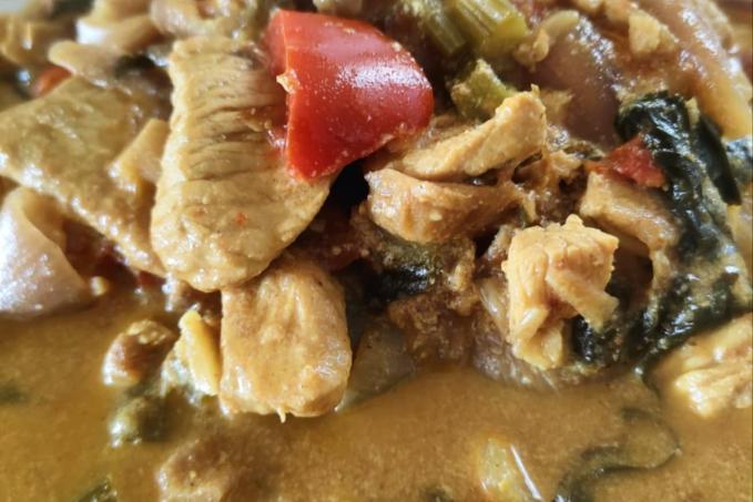 Přidáme na větší kusy nakrájenou cibuli na kousky nakrájené houby, ostatní zeleninu, koření a zalijeme kokosovým mlékem. Dusíme pod pokličkou doměkka.