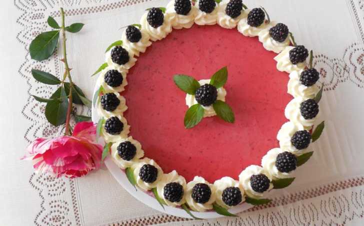Po ztuhnutí želatiny ozdobte dort ušlehanou šlehačkou a ovocem. Dort podávejte vychlazený.