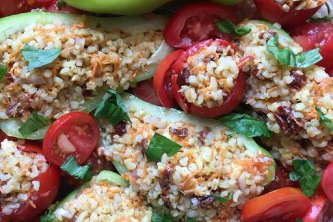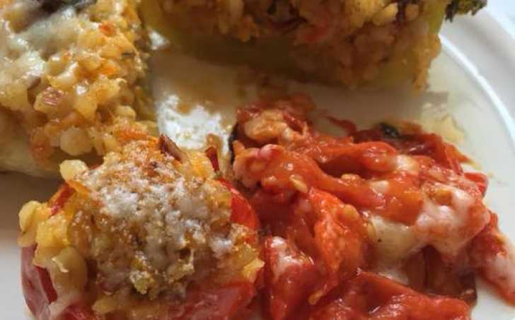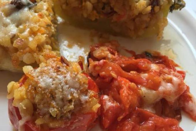 Rajčata a papriky očistíme, vydlabeme. Do nich dáme směs uvařeného bulguru (dle návodu na obalu), který jsme smíchali s opraženou šalotkou a česnekem na olivovém oleji, nastrouhanou mrkví, sušenými rajčaty a nastrouhanou mozzarellou, solí a pepřem.