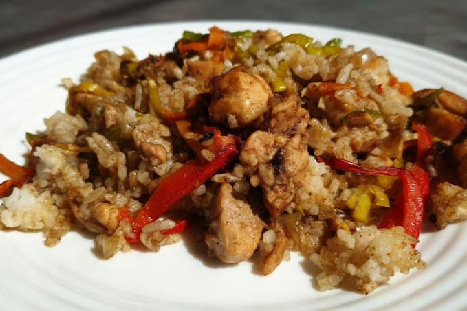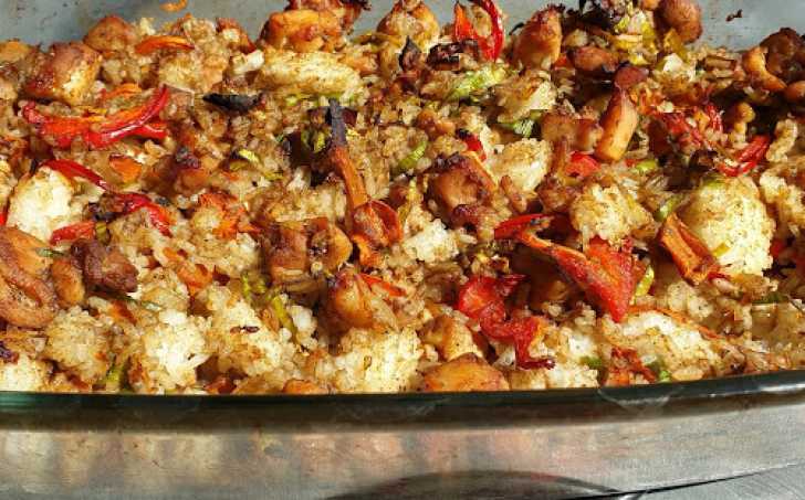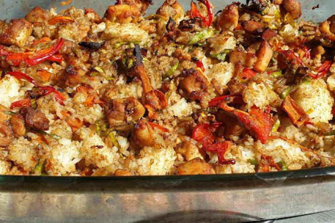 Směs přidáme k rýži, promícháme a pečeme v troubě na nejvyšší teplotu zhruba 10 minut, aby se povrch pokrmu zabarvil.