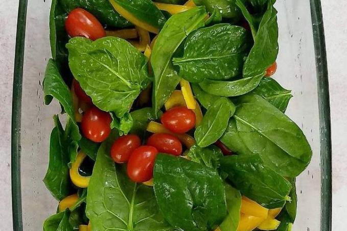 3. Na dno žáruvzdorné nádoby nalijte dvě lžíce olivového oleje. Do misky vložte omytý baby špenát, celá cherry rajčata a žlutou papriku nakrájenou na krátké proužky bez semínek.