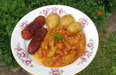 Cibuli nakrájíme na půlkolečka a pomalu smažíme na oleji. V průběhu smažení k ní přihodíme i česnek nakrájený na tenké plátky. Když začne cibule sklovatět přisypeme cukr, díky čemuž cibule pustí vodu. Výslednou směs přendáme na dno pekáčku.