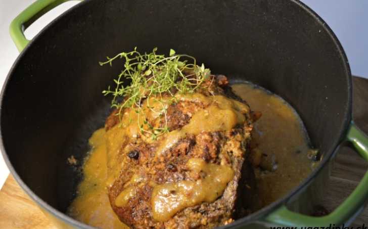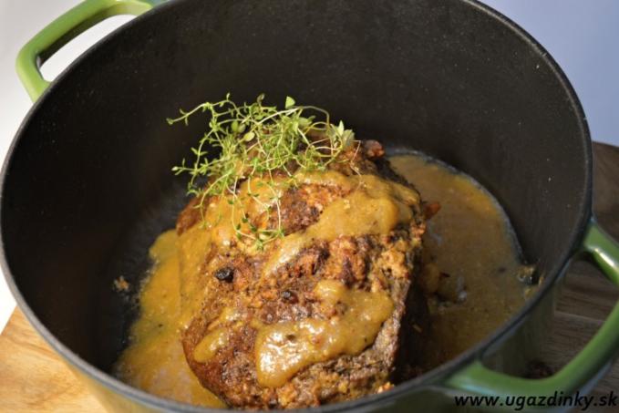 Odležané mäso dáme do pekáča, podlejeme hovädzím vývarom/ vodou a zakryté pečieme 2 hodiny.