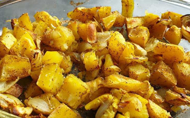 Brambory oloupeme a nakrájíme na kostičky cca 1x 1 cm. Cibuli nakrájíme na drobno. Rozložíme na pekáček, který jsme vytřeli olejem. Stačí 2 – 3 kapky. Posypeme kořením. Vložíme do trouby a pečeme na střední teplotu až povrch lehce zezlátne.