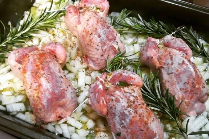 Částí nádivky naplníme křepelky. Křepelky pak uzavřeme, potřeme poctivě sádlem ze všech stran. Cibuli v pekáči mírně podlijeme, zakápneme olejem, osolíme, opepříme. Přidáme snítky rozmarýnu a na tento základ položíme křepelky.