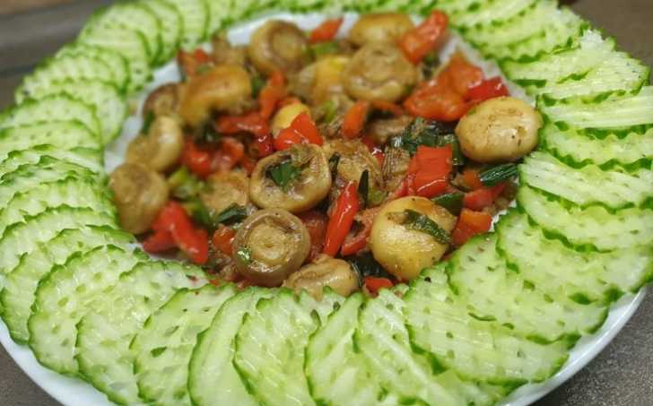 Nejprve jsem očistil a oloupal žampióny, začal smažit na pánvi na ghí, mezitím nakrájel kapii a přihodil do pánve, očistil a nakrájel jarní cibulku, také přidal a nakonec oloupal česnek, prolisoval a ten přidal už jen na cca 1/2 minutky. Během pečení osolil a opepřil. Miluji toto jídlo, s nakrájenou studenou okurkou je to top.