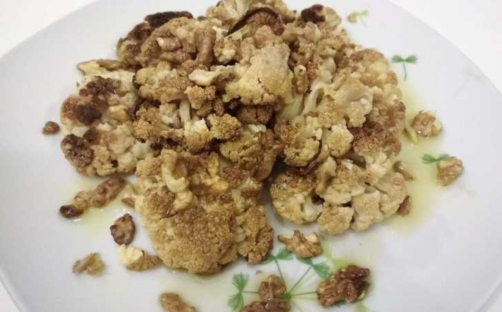 Hotový květák jsem posypala ořechy, posolila a polila štědrou dávkou olivového oleje.