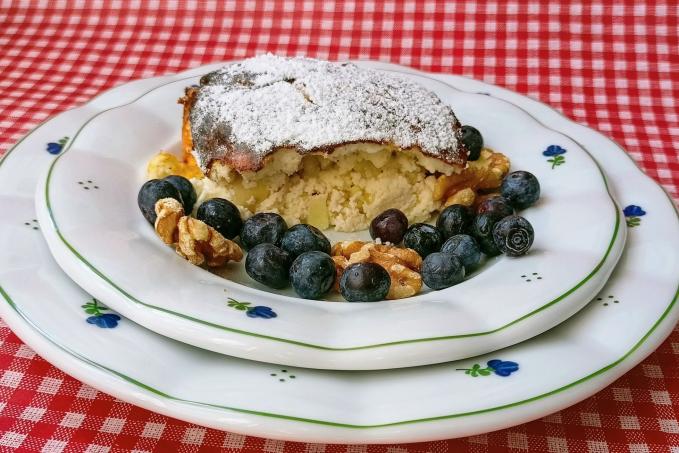Zapékací mísu vymažeme máslem a dáme do ní polovinu těsta. Poklademe kousky ovoce a ořechy a pokryjeme druhou polovinou těsta. Uhladíme a pečeme na 170°C.asi 50 minut.