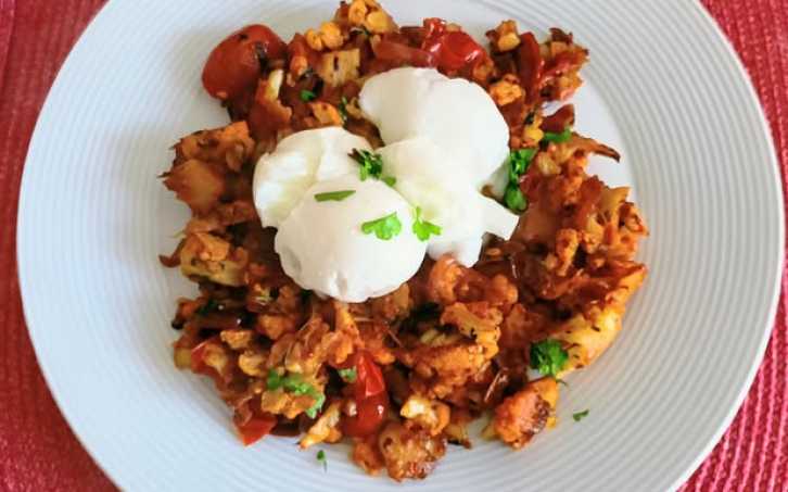 Na sádle krátce osmahneme cibuli, přidáme květák, osolíme, opepříme, přidáme kari , česnek a restujeme za stálého míchání a přidáme harisu a protlak. Podle potřeby trochu podlijeme vodou, přidáme rajčátka