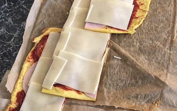 Protlak natřít na vychladnuté těsto, posypat oregánem, obložit sýrem a šunkou.