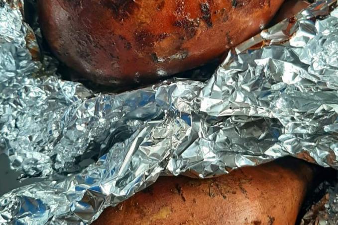 Bataty si omyjeme ,pripravime si alobal,bataty namazeme olivovym olejem a zabalime do alobalu a dame pect tak na hodinu do trouby na 200 stupnu,kontrola jestli jsou mekke a pak na chvilku znova do trouby ,ale uz odkryte ,aby slupka ztmavla.Pak jsou hotove.