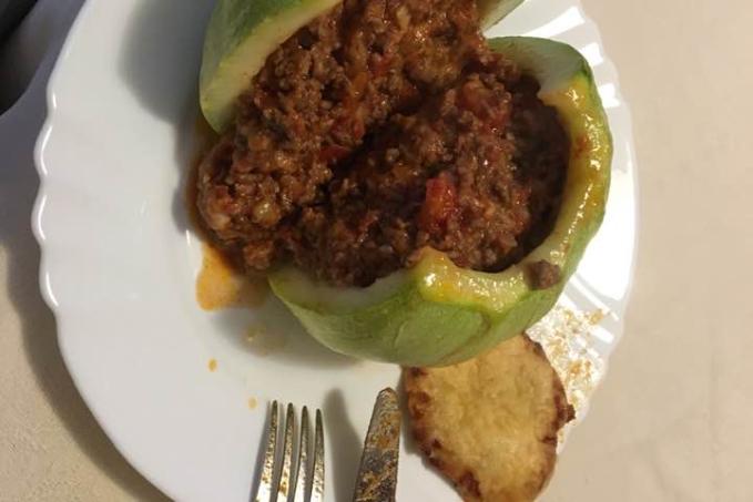 Uříznout vršek cuket a vydlabat. Zpěnit jednu velkou cibuli, přidat 500 g hovězího mletého masa a sůl a pepř. Až je maso osmahnuté, přidat pokrájené vydlabané vnitřky cuket (nedavala jsem vše) a dvě velká rajčata.
