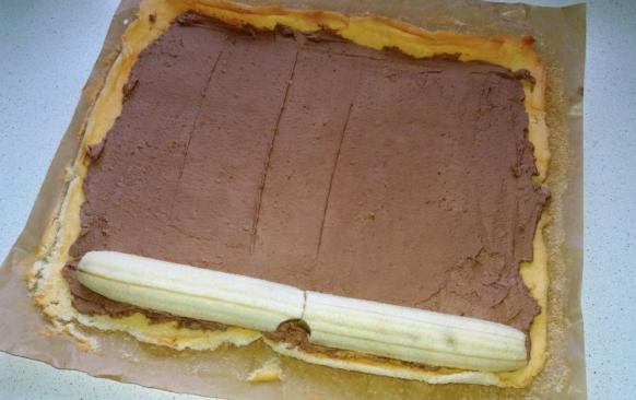 Krém: Smetanu šlehejte se ztužovačem téměř do zhoustnutí. Chvíli před došleháním přisypte kakao a došlehejte dotuha. Vznikne jednoduchá pařížská šlehačka. 3/4 krému potřete vychladlý plát a na kraj položte rozřízlý oloupaný banán. Roládu smotejte a nechejte v chladnu odpočinout.