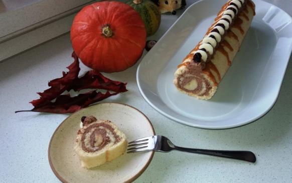 V rendlíku rozpusťte krupicový cukr na karamel, poté přilijte smetanu a vymíchejte v hladký krém (pokud by byl tuhý, přilijte smetanu, pokud by byl řídký, nechte chvíli vyvařit). Karamelovou polevou pocákejte povrch rolády, aby vznikl efekt stékání. Nechejte chvíli vychladnout.