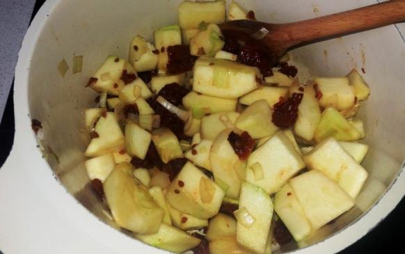 Na másle zpěníme cibulku, přisypeme pokrájená sušená rajčata a na kostičky nakrájený patizon. Chvíli opékáme.