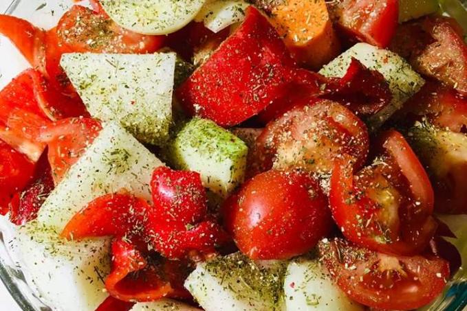 Rajčata, paprika, mrkev, cibule, bílá ředkev, kedlubna. Troubu rozehřát naplno, zeleninu zakápnout olivovým olejem, dát bylinky a asi půl hodiny péct.