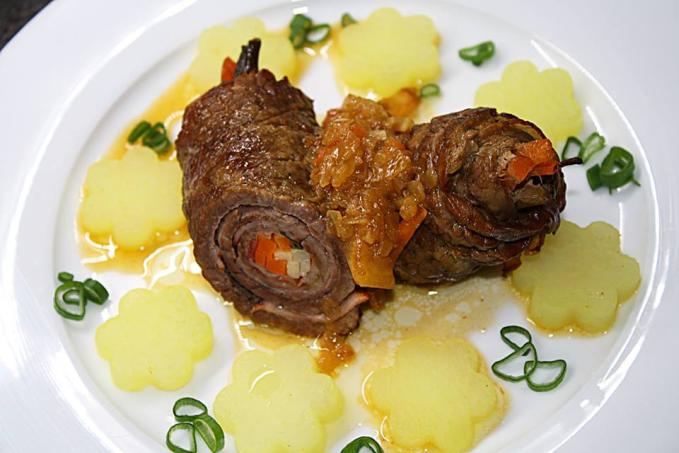 Tenký plátek hovězího masa osolit a opepřit (možno potřít hořčicí), poklást po celé ploše slaninou, na kraj naskládat dlouhý list-nať čerstvé jarní cibulky, proužky celeru a mrkve a zabalit do masa.
