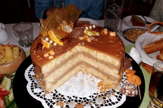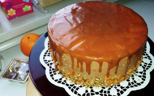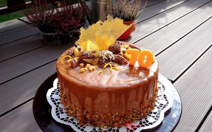 Ozdobte kousky pomeranče, pekany v karamelu, čokoládovými ozdobami, nastrouhanou pomerančovou kůrou a z vychladlé karamelové placky opatrně nalámejte "střepy" a zapíchněte do dortu. Nechejte vychladit. Dobrou chuť.