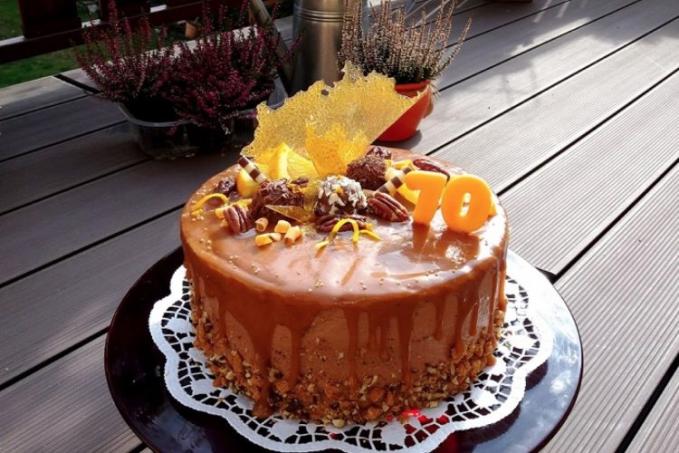 Karamelovou polevu poté stáhněte z plotny a ještě chvíli míchejte, aby trochu vychládla a zhoustla. Poté ji naneste na dort, můžete vytvořit opatrným roztíráním efekt stékání.