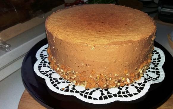 Boky dortu obmažte odloženým krémem. Nechejte vychladit. 5–8 ořechů nakrájejte nahrubou a smíchejte s nalámanými kousky 2–3 sušenek Lotus. Vychlazený dort opatrně držte za vrchní nepotřenou plochu na dlani a nad mísou opatrně druhou rukou připlácněte do spodního okraje krému ořechovo-sušenkovou drobenku. Poté již dort postavte na závěrečnou podložku, na níž již zůstane po celou dobu. Nechejte opět vychladit.