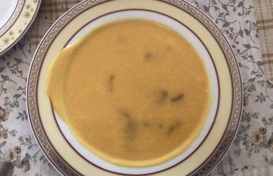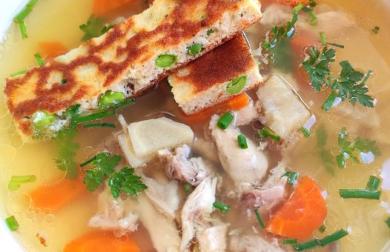 Pórek si nakrájíme, orestujeme v hrnci na másle, zalijeme kuřecím vývarem a vaříme doměkka. Přihodíme zeleninu z vývaru a vše rozmixujeme, dochutíme solí, pepřem a muškátovým oříškem. Obereme maso ze skeletu, opražíme ho na pánvi a přidáme do polévky.