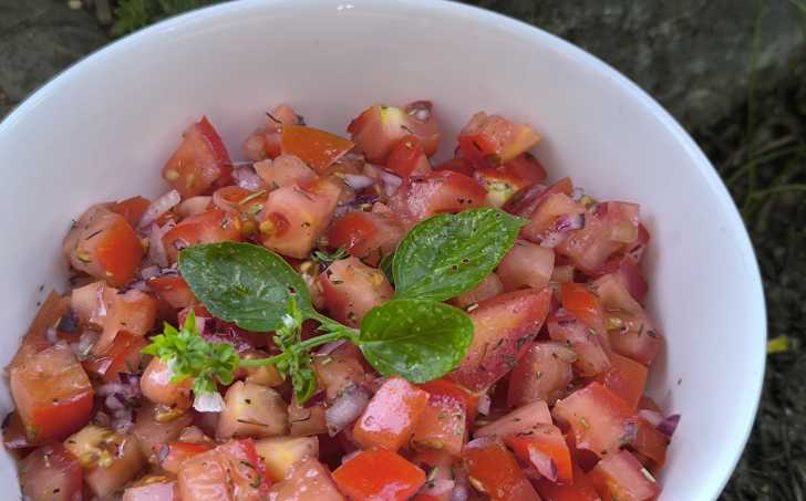 Do mísy dáme nakrájená rajčata a cibuli, ochutíme octem, solí, čerstvě namletým pepřem a sušenou bazalkou. Pokud máme k dispozici čerstvé bylinky, můžeme přidat i je – bazalku, tymián nebo hladkolistou petržel.