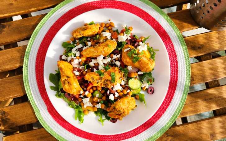 Na talíř nejprve rozprostřeme hrst rukoly, na ni navrstvíme řecký salát, poté přidáme křupavou cizrnu a opečené kuřecí maso. Nakonec vše posypeme rozdrobeným sýrem feta nebo balkánským sýrem a dochutíme nasekanou mátou, která dodá celému jídlu svěží chuť.