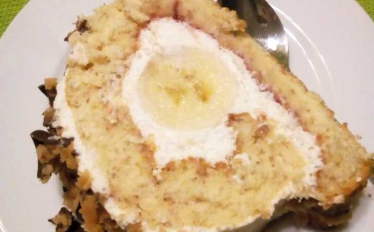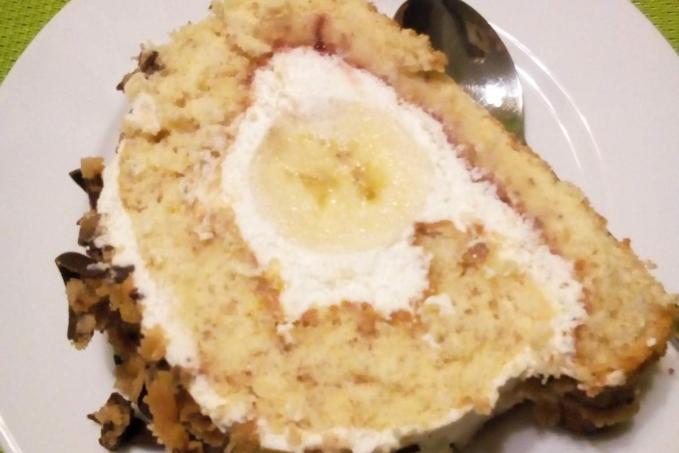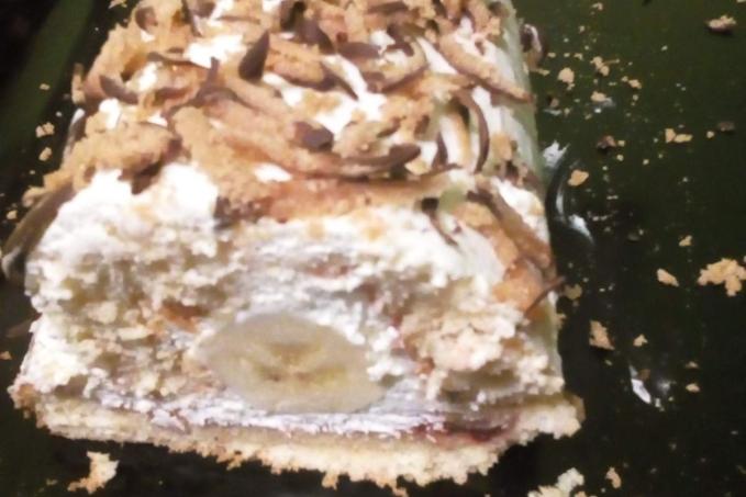 Roládu opatrně rozbalíme, potřeme marmeládou, většinou krému. Na kraj položíme banány a pevně zarolujeme.