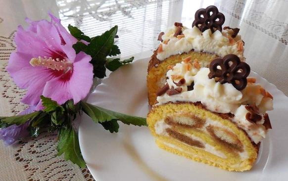 Na vychladlý piškot natřeme vrstvu krému, asi třetinu necháme stranou na ozdobu. Po délce k jedné straně položíme 3 piškoty namočené v kávě s rumem. Roládu trochu zavineme a položíme další tři piškoty. Opět trochu zavineme a položíme poslední piškoty. Zavineme zbytek rolády. Roládu posypeme přes sítko práškovým kakaem. Zbylý krém dáme do sáčku s cukrářskou špičkou a nastříkáme na roládu. Ozdobíme čokoládou, případně jiným zdobením.