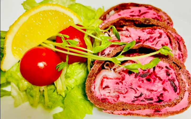 Schladlý plát potřeme náplní, poklademe schwarzwaldskou (nebo jinou) šunkou a zarolujeme. Dáme vychladit a krájíme na úhledné plátky.