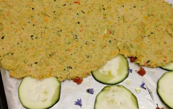 Na pečící papír rovnoměrně těsto rozprostřeme. Já jsem chtěla roládu ozdobit tenkými plátky cukety, tak jsem je naskládala na papír jako první a následně přidala těsto.