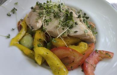 Letní salát ze sezónní zeleniny a ovoce a spousty bílkovin.
