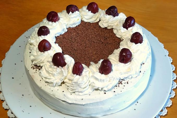 5. Na velký talíř jsem položila spodní díl korpusu. Pokladla jsem ho několika třešněmi, navrstvila jsem na ně třetinu krému a opatrně ho uhladila. Totéž jsem zopakovala po přiložení prostředního dílu korpusu. Nakonec jsem opatrně přiklopila horním dílem (nezapomeňte přiklopit dolů stranou potřenou třešňovou směsí). Zbytek krému jsem použila nahoru na dort a na jeho obmazání.