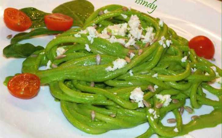 Veškeré suroviny rozmixujeme v mixéru na hladkou hmotu a přelijeme do širokého hrnce. Krátce prohřejeme a vmícháme špagety. Na talíři můžeme posypat semínky a kouskem balkánského sýra.