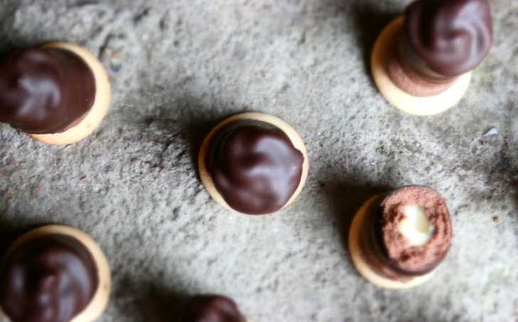 - do dalšího zdobícího sáčku s libovolnou cukrářskou špičkou dejte odložený čokoládový krém a uzavřete vršky naplněných korpusů