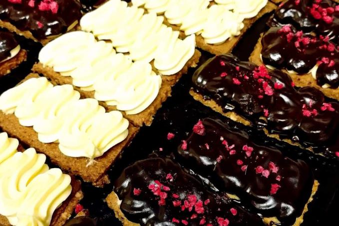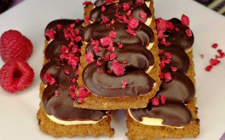 Rozpustíme 100 g čokolády 75 % s 50 g másla a po lžičkách přidáváme 1 dl silné instantní kávy ještě horké. Čokoláda bude řidší. Necháme ji trochu vychladnout a sušenky se ztuhlým žloutkovým krémem v čokoládě namočíme. Ještě než čokoláda vystydne, posypeme sušenky rozdrobenými malinami sušenými mrazem.