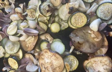 Rozpálím pánev a velmi lehce ji potřu přepuštěným máslem (dobře snáší vysoké teploty). Na pánev položím plátky sýru halloumi a na mírnějším plameni restuji dozlatova z obou stran. Mezitím si připravím přílohu. Polníček, rajčata, papriku a ředkvičky omyju, případně nakrájím na menší kousky. Salát jsem ochutila pouze solí, pepřem, špetkou sušené bazalky, lněným olejem a citronovou šťávou.