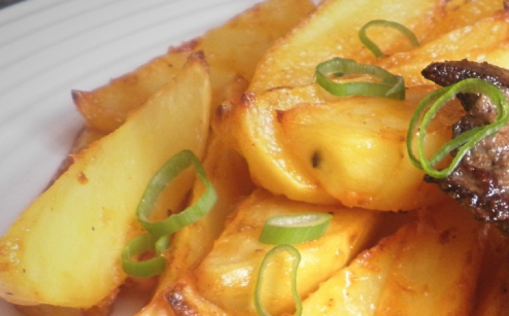 Oloupané brambory omyjeme, nakrájíme na čtvrtiny nebo šestiny (to záleží na velikosti), vložíme do mísy, zalijeme studenou vodou a necháme "máčet" asi 10 minut. Poté brambory scedíme a osušíme v utěrce.