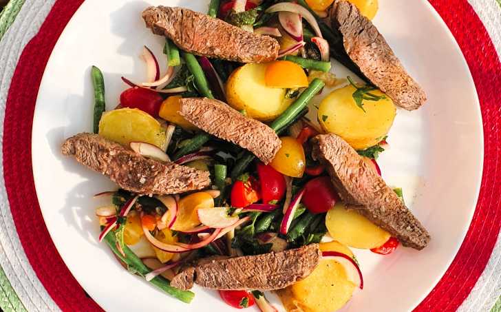 Skvělé jídlo na letní oběd nebo večeři – jednoduchý, svěží bramborový salát s fazolkami doplňuje poctivý flák masa. Ideální kombinace pro milovníky dobrého masa i lehčích příloh.