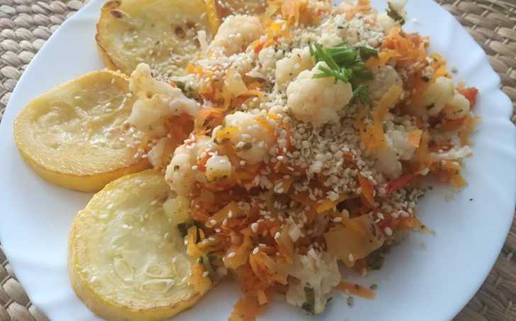 Salát dáme na talíř, bohatě zasypeme konopnými a sezamovými semínky, přidáme dvě lžíce olivového oleje a podáváme s cuketou opečenou na pánvi.