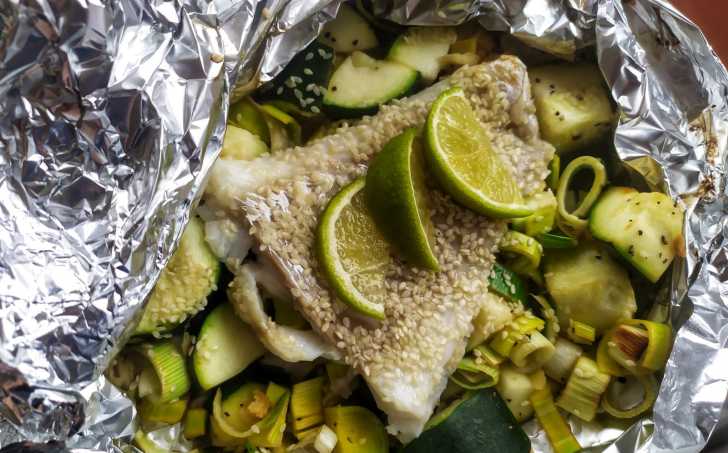 Zeleninu nakrájíme na podobně velké kousky. Pak si připravíme marinádu - utřeme česnek, nastrouháme zázvor, přidáme olivový olej, citronovou nebo limetkovou šťávu, pepř a sůl. V marinádě obalíme tresku i zeleninu.