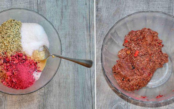 Sušené ovoce v pytlíku naklepu paličkou na maso, aby se rozmělnilo, ale nebylo úplně na prášek. Všechny ingredience smíchám v misce dohromady.