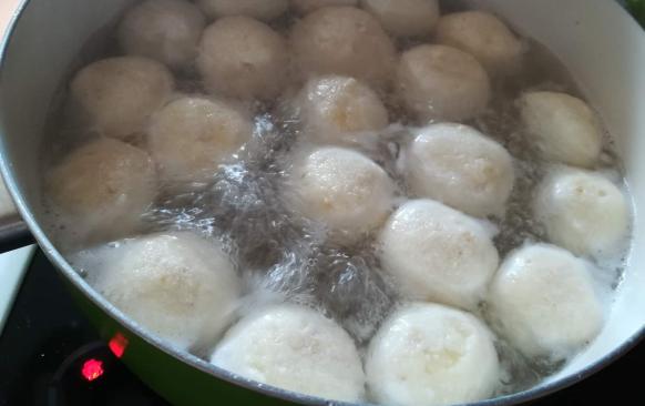 Ze surovin vypracujte těsto, vytvarujte větší kuličky a vařte ve vroucí vodě, poté co vyplavou v hrnci nahoru cca 8-10minut.