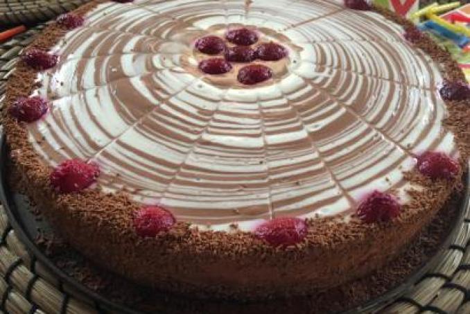 Nyní máme 1/2 světlý krém a 1/2 kakaový krém. Do 200 ml mléka, které lehce zahřejete rozmíchejte ztužovače. Směs rozdělte do obou krémů a nechte 30 minut vychladit. Nyní postupně po lžičkách vrstvěte na korpus. 1 lžíce bílého krému a 1 lžíce kakaového krému. Začnete ze středu. Krém se bude postupně ve vrstvách rozlévat po celé formě.