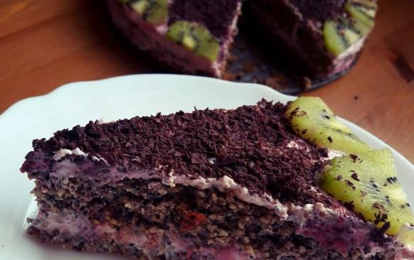 Když máme dort naplňený a pomazaný tvarohem, ozdobíme si ho libovolným ovocem a můžeme i posypat nastrouhanou vysokoprocentní čokoládou. Fantazii se meze nekladou.