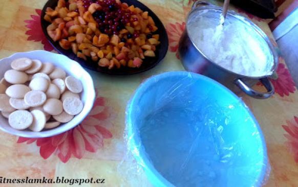 Celé dno nádoby (kterou předtím "vystelu" potravinovou fólií) pokryju nakrájeným ovocem a potom navrstvím krém.